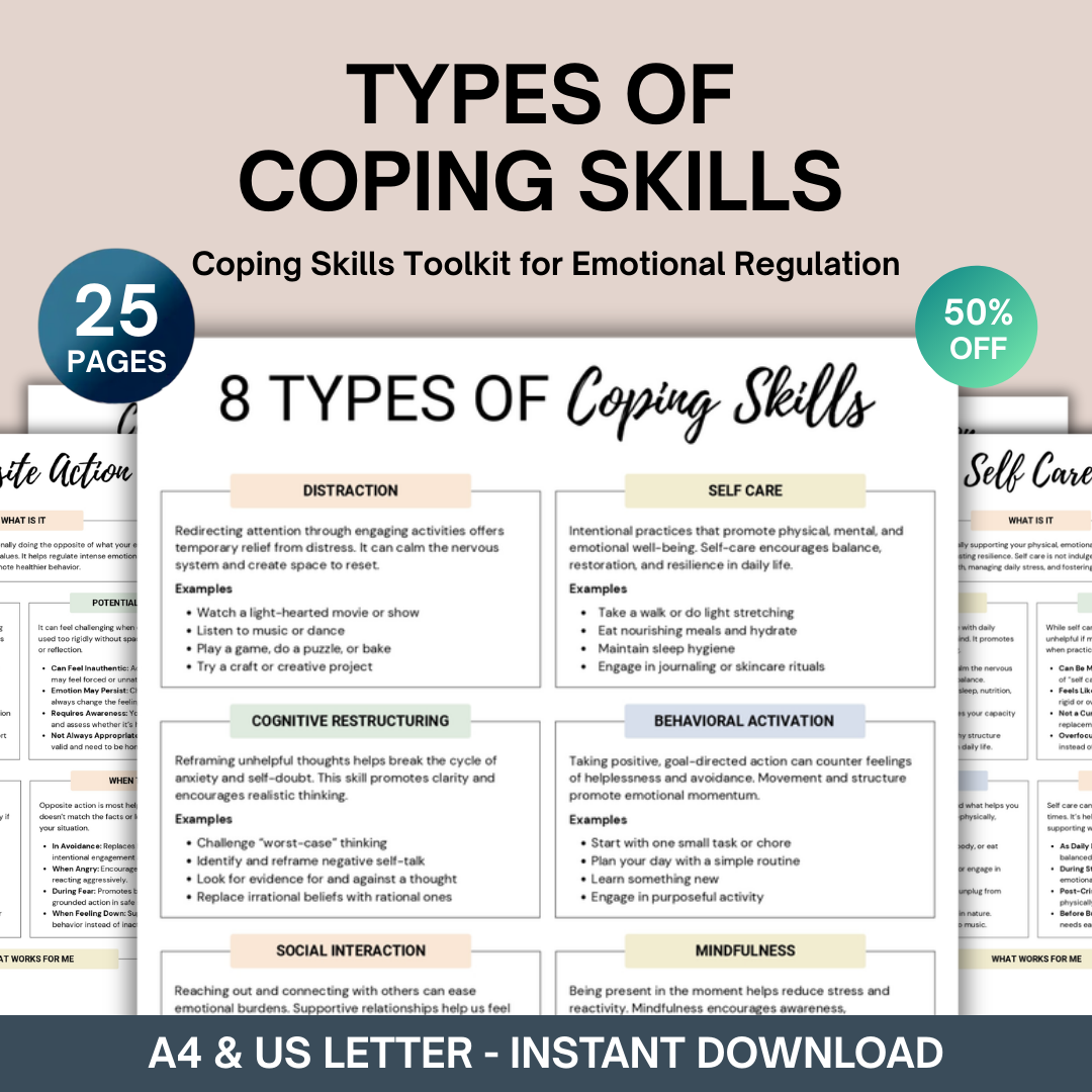 8 Types of Coping Skills Worksheets, Coping Skills Toolkit for Emotional Regulation