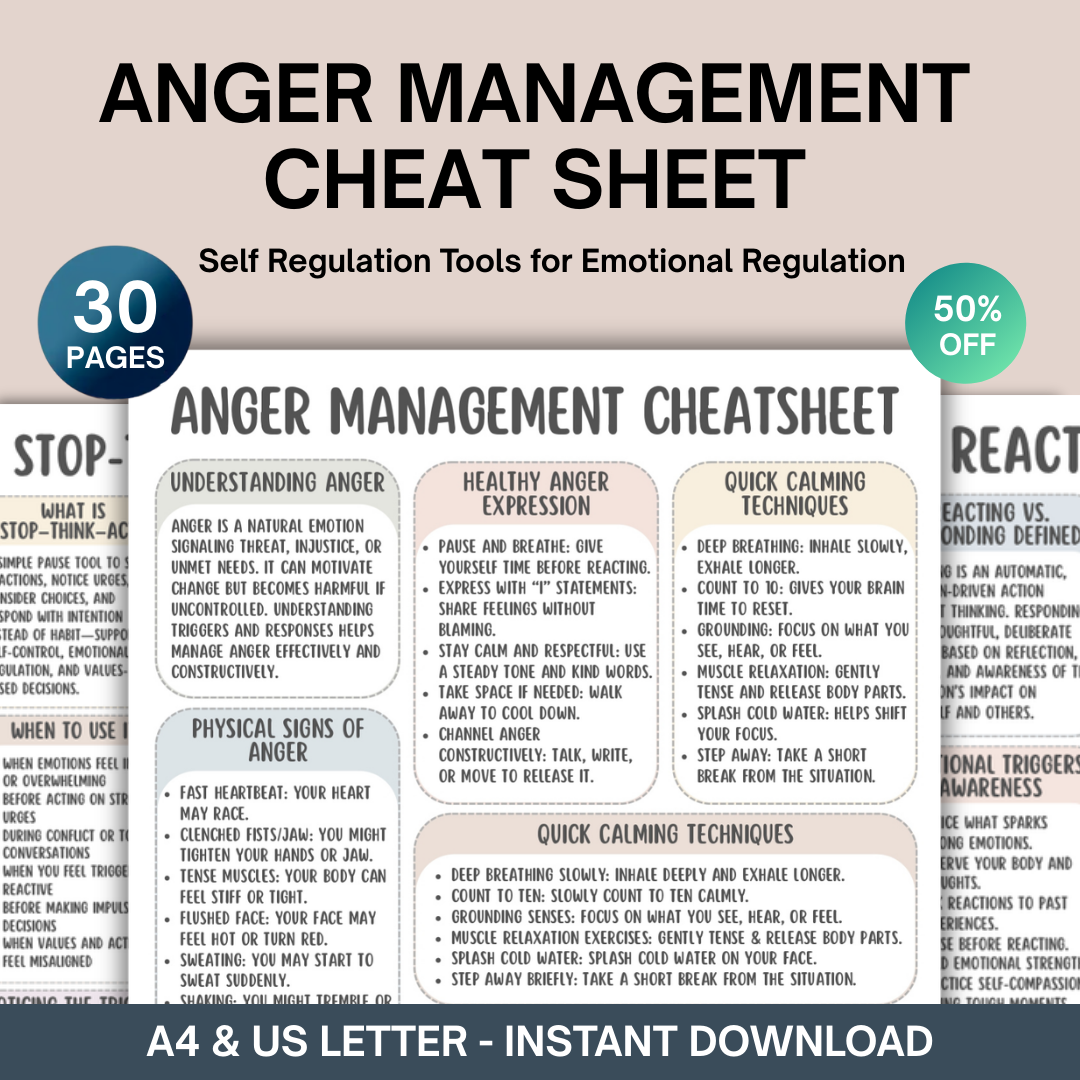 Anger Management Cheat Sheet, Emotional Regulation, Mental Health Printable, Self Regulation Tools